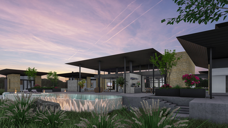 The main volumes are pulled apart and connected with low, flat-roofed glass connectors, offering visual moments of delight into pocket courtyards, the distant vistas, or a plane of water resting at the window’s edge. The home’s muscular base of Oklahoma-sourced stone, natural toned wood plank soffits, and crafted metal details root the home to its place.